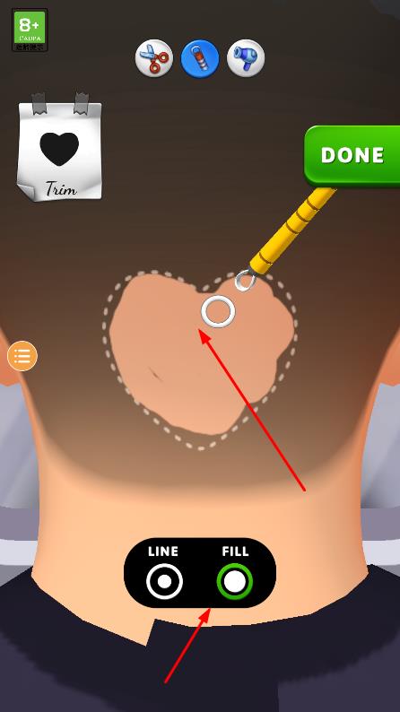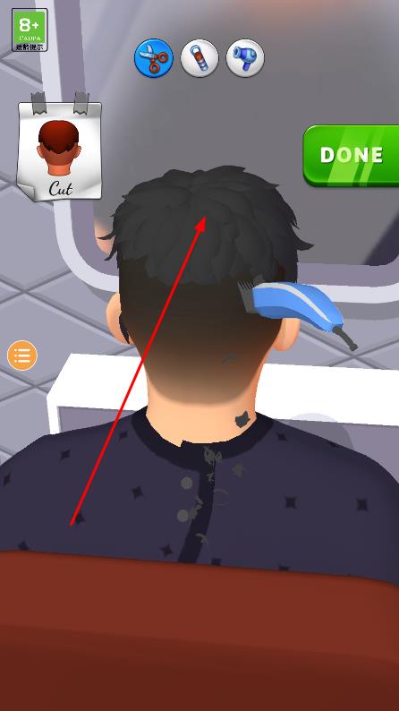 2、屏幕上方有三种理发工具图标,分别是剪刀、剃刀和吹风机,根据顾客需求,选择合适的工具,对顾客的头发进行修剪。