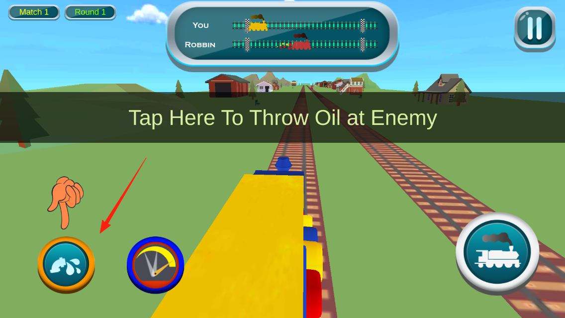 3、点击油桶按钮投掷油污,干扰对手火车阻碍其前进,在竞速中制造障碍,体验策略对抗玩法。