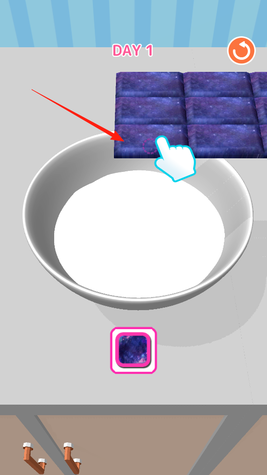 1、点击紫色方块放入碗中,按照指引添加材料,开启制作流程,体验材料组合机制。