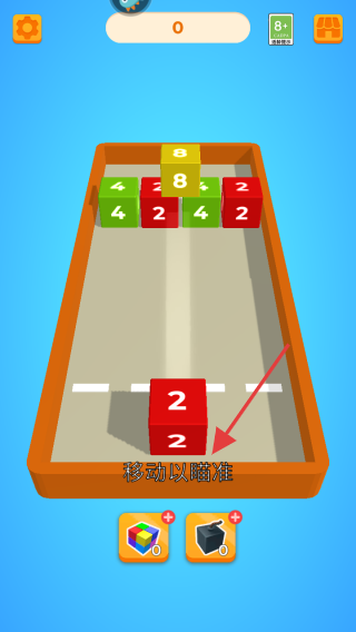 1、游戏开始时,界面会提示移动以瞄准,你需要通过移动下方的方块,瞄准上方对应数字的方块进行发射,使相同数字的方块碰撞合并。