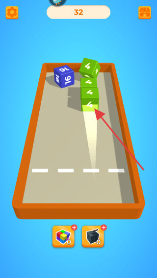 2、在游戏过程中,发射方块后,相同数字的方块会进行合并,如绿色的4方块相互碰撞合并,不断合并方块来获取更高分数。