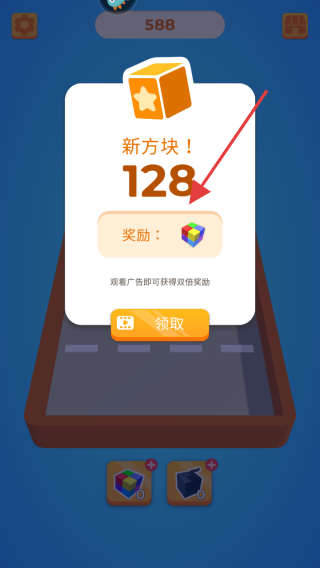 3、当你合成出新的方块时,如新方块!128,会弹出奖励提示框,点击领取按钮可获取相应奖励,也可选择观看广告获得双倍奖励。
