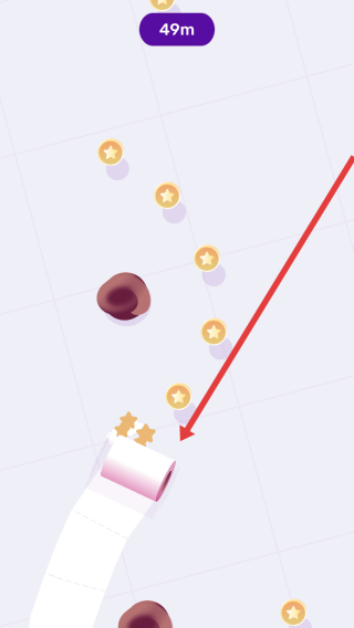 2、在跑酷过程中,需要滑动屏幕操控卫生纸卷避开障碍物,收集金币和星星,延长奔跑距离。