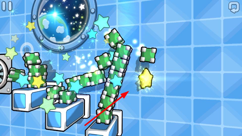 2、松开手指将机器人发射出去,利用反弹墙改变轨迹,碰到火箭时使其炸开通路,借助不同颜色方块被击中后的飘散方向收集星星。