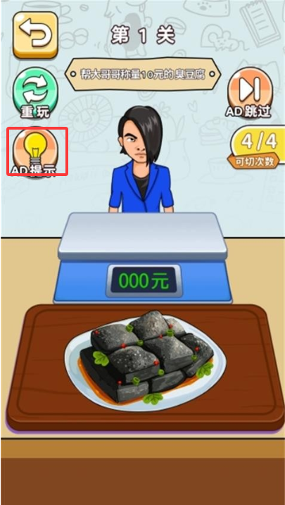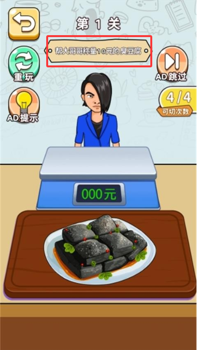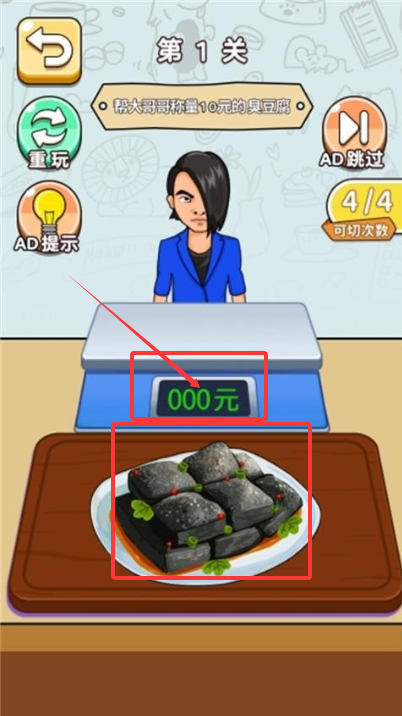 2、帮大哥哥称量10元的臭豆腐,即可过关。