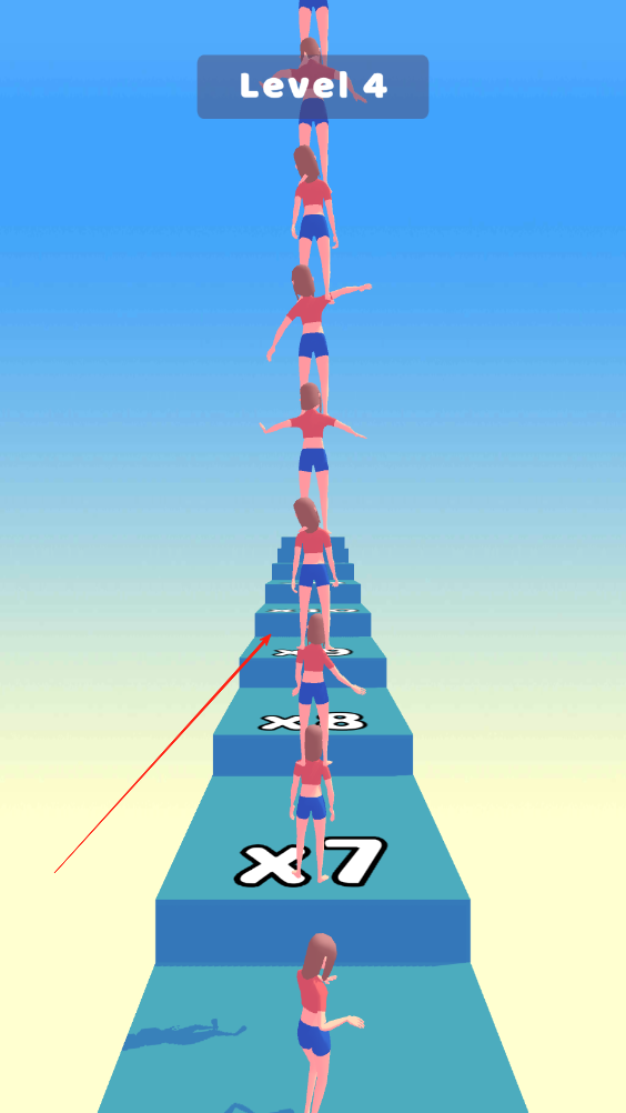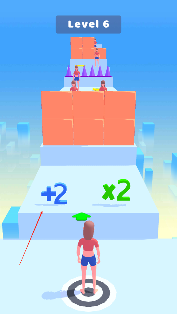 2、当箭头指向能使人数变得更多的数时点击屏幕让小人跳跃即可,如果小人走到台阶前没来得及选择,就会放弃选择,小人自行爬上阶梯。