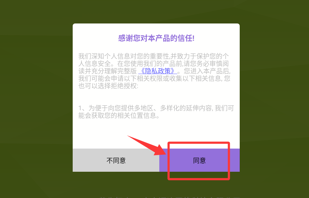 1、点击红色框框的同意并进入游戏。