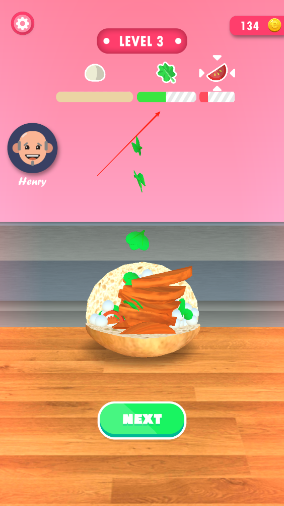2、上方显示顾客对配料的要求及数量,长按即可落下食材,看着进度条及时松手避免放多,且进入下一项食材的摆放。