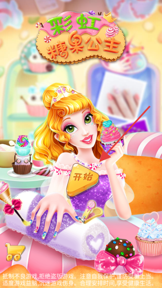1、这是一款名为彩虹糖果公主的游戏,在初始界面,点击开始按钮,即可进入游戏角色选择界面。