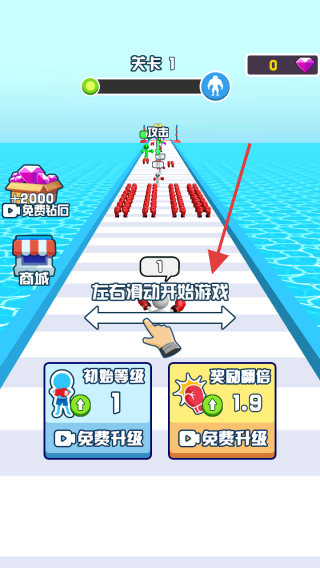 1、在关卡1开始时,界面提示左右滑动开始游戏,你需要通过左右滑动屏幕来控制角色移动,躲避障碍物并收集道具,开始游戏挑战。