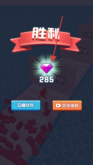 3、当你成功完成关卡后,会显示胜利界面,获得相应的奖励,如285颗钻石,你可以选择忍痛放弃或观看广告双倍领取奖励。