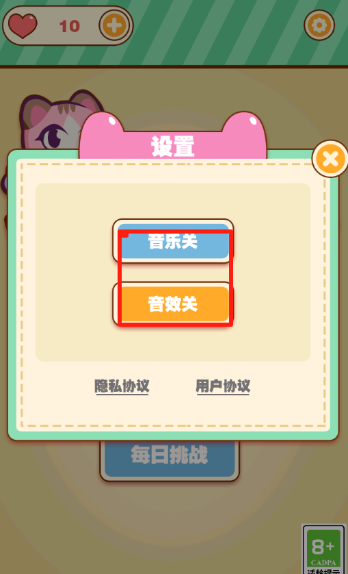 3、点击设置进来把音乐和音效都打开来体验游戏吧。