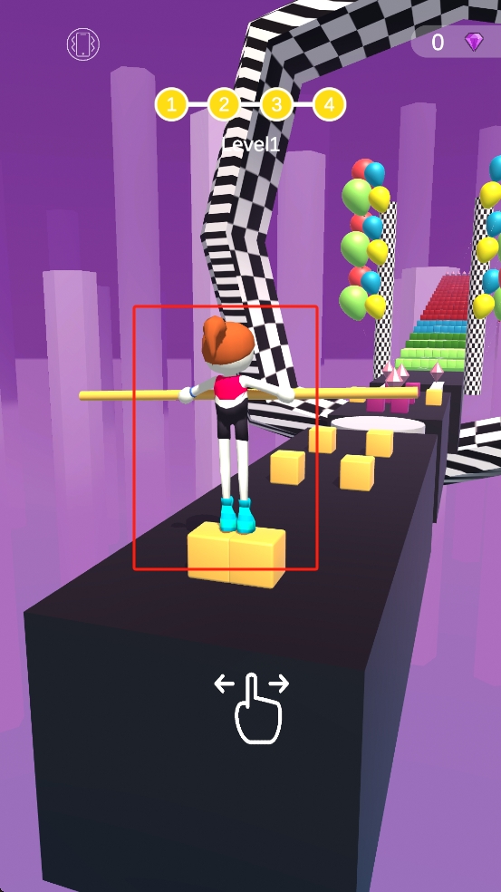 2、我们需要跨越间隔方块,通过滑动精准控制平衡杆长度与角度,让角色双脚落于方块即可。