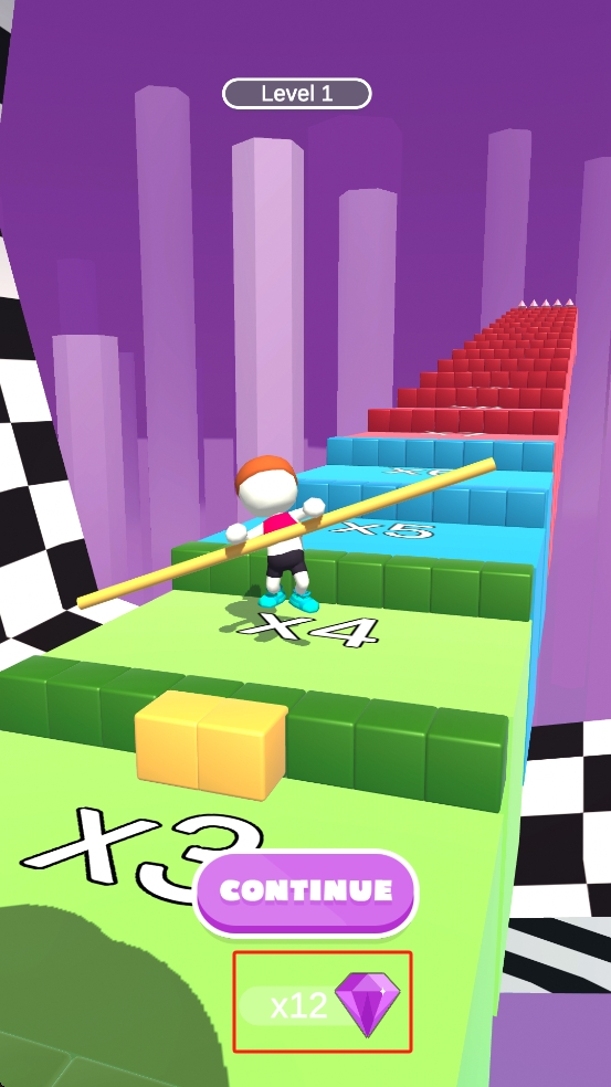 3、成功抵达关卡终点时,界面显示CONTINUE按钮,点击可继续,下方红框是奖励的12颗钻石,可用于解锁皮肤、道具等。