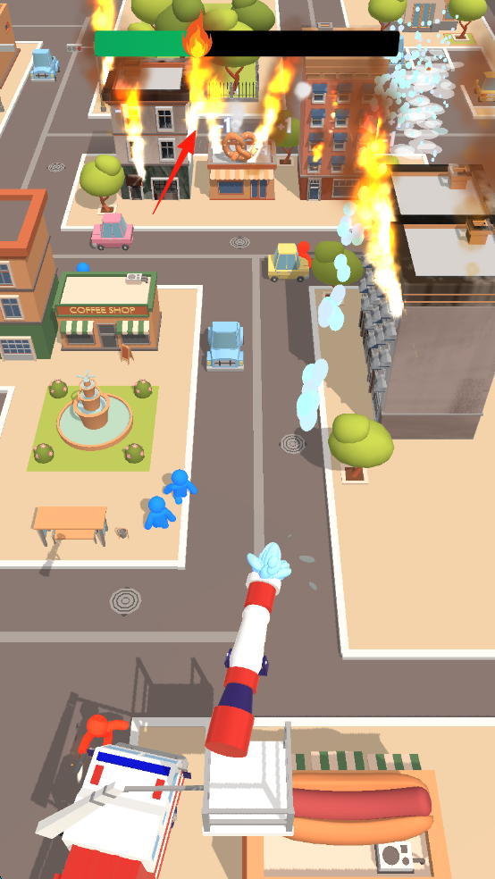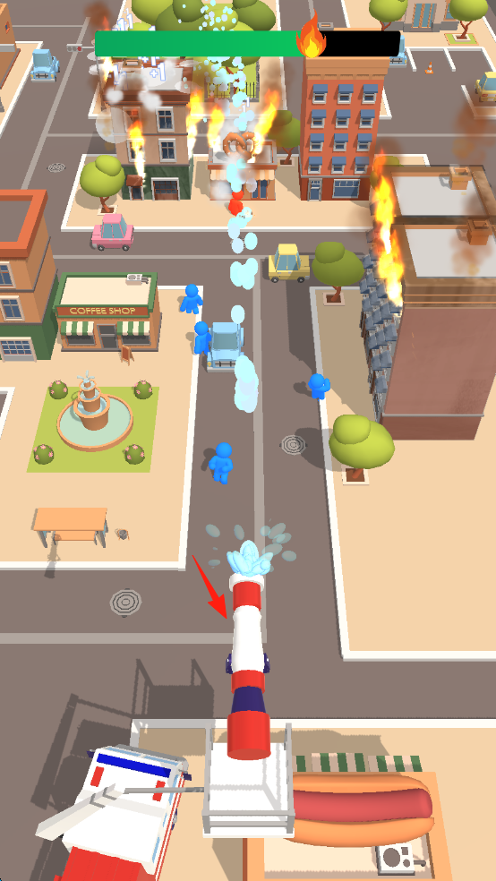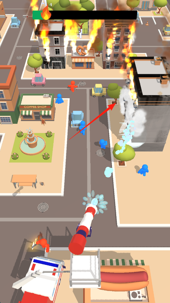 1、操控消防水管,瞄准街道上着火的建筑,持续喷水灭火,过程中注意避让蓝色行人,保障灭火路径顺畅。