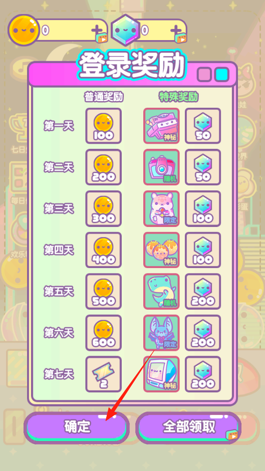 1、点击确定领取登录奖励,根据累计登录天数,获取对应金币与道具,推进游戏资源积累。