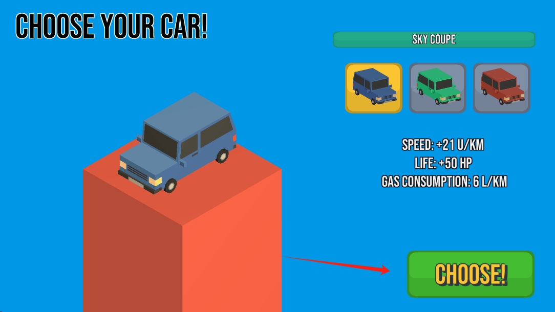 1、在游戏选车界面,根据速度、生命值和油耗等属性,选择合适的赛车,开启冒险之旅。