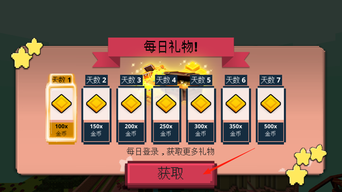 1、点击获取,领取每日奖励,根据登录天数获得对应金币,连续登录可解锁更多金币,积累游戏资源。