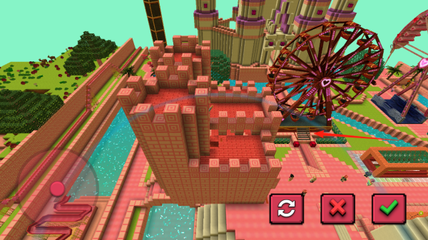 3、操作视角浏览乐园,查看城堡摩天轮等建筑布局,检查建造成果,确认后点击对勾,完成建造流程。