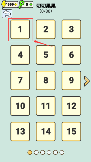 3、点击红框数字1方块,开始切切果果第一关挑战。