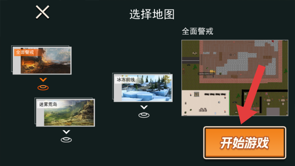 1、可选择的地图名称,包括全面警戒、冰冻前线、迷雾荒岛,还有开始游戏按钮,玩家选定地图后点击该按钮可进入对应地图开始。
