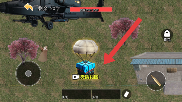 2、剩余数量20、直升机、支援礼包、背包按钮、地面建筑、武器图标及左下角操作摇杆,呈现了场景与交互元素,玩家可操作角色获取支援礼包等。