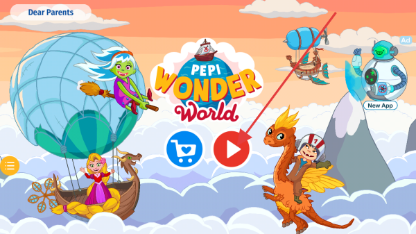 2、这是一款名为PEPI WONDER World的游戏,界面中有购物车和开始游戏按钮,点击红色播放按钮即可进入游戏开始冒险。
