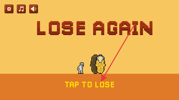 1、当游戏失败显示LOSE AGAIN界面时,点击TAP TO LOSE按钮,可重新开始游戏挑战,继续你的冒险之旅。