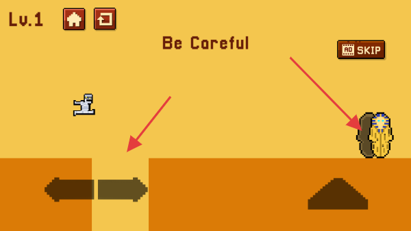 3、在游戏过程中,角色会遇到各种危险,如掉落悬崖等,你需要及时操控角色躲避,同时界面右上角有SKIP按钮,可选择跳过当前关卡。