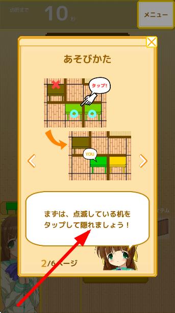 1、游戏提示界面,阅读说明,按指引点击闪烁的桌子,完成躲藏准备步骤,推进玩法教学流程。