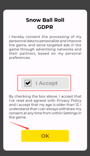 1、勾选红框I Accept选项,同意游戏数据处理条款。