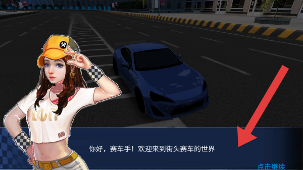 1、画面中女性角色是赛车手形象,文字内容是欢迎来到街头赛车的世界,下方有点击继续的交互提示。