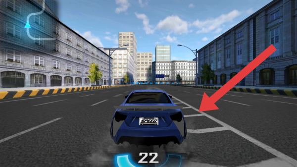 2、呈现了赛车在城市道路行驶的场景,能看到赛车外观、道路及建筑环境,箭头指向赛车行驶路线相关区域。