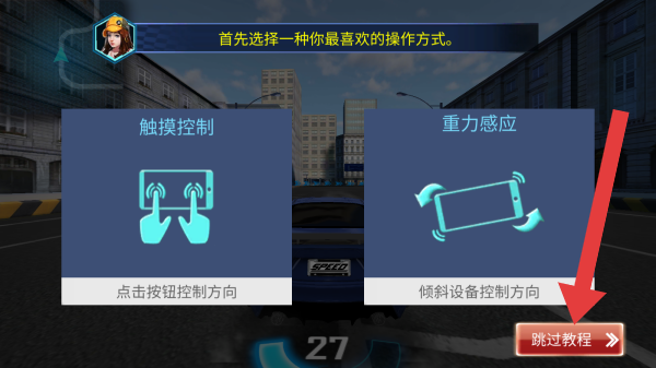 3、属于街头赛车,操作方式分触摸控制点击按钮控制方向和重力感应倾斜设备控制方向,还有跳过教程按钮。