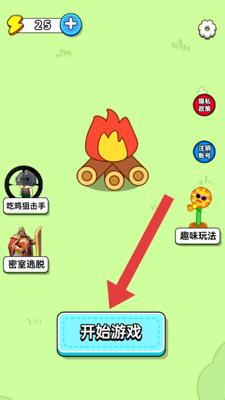 1、点击开始游戏的按钮,还有吃鸡狙击手、密室逃脱、趣味玩法等模式选项,属于一款包含多种玩法的休闲游戏启动界面。