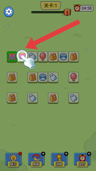 2、显示关卡为1,剩余时间04:58,界面下方有提示、刷新、消除、加时等功能按钮,玩家正操作点击选中图标进行消除操作。