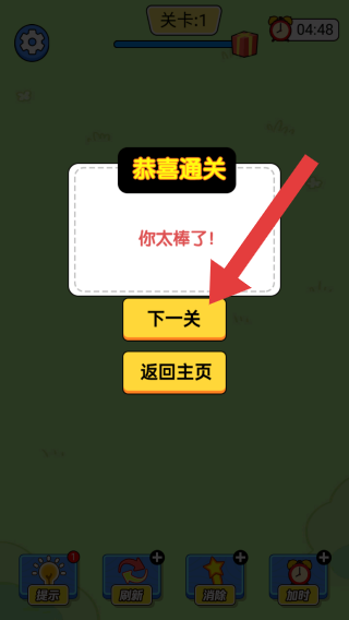 3、恭喜通关你太棒了!点击下一关方可继续游玩,表明玩家完成第1关,可选择进入下一关或返回主页。