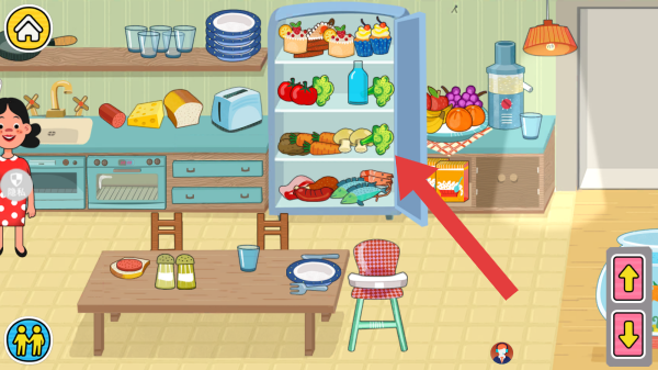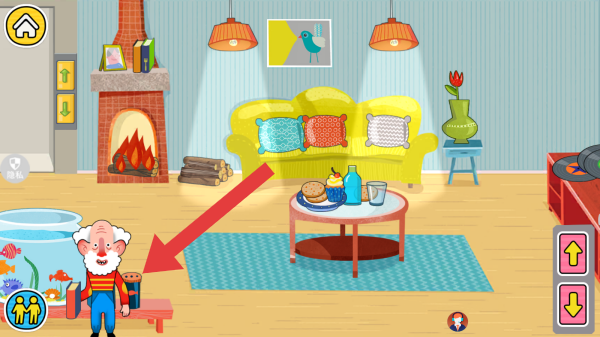 3、画面里有卡通风格的角色、壁炉、沙发、茶几、鱼缸、音响等元素,打造了温馨小镇家庭场景,用于儿童进行互动探索、模拟生活情境。