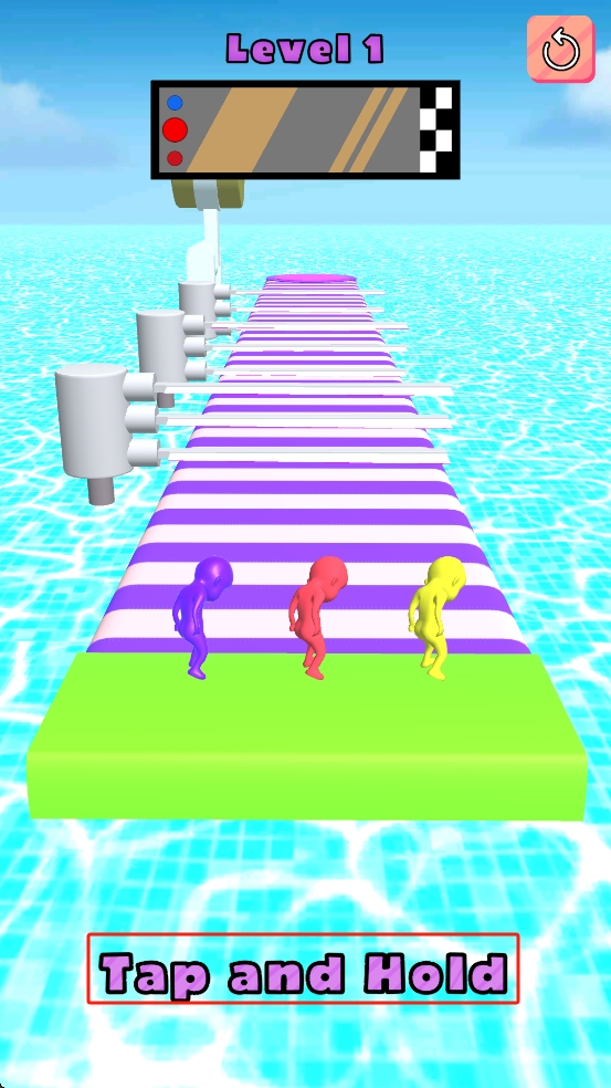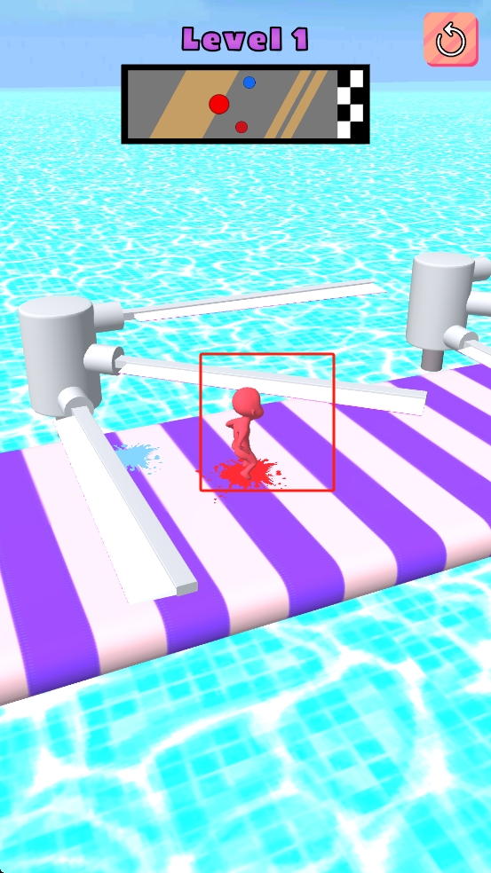 2、观察障碍运动规律,灵活长按或松开调整角色路径,避开白色旋转杆,别让角色被击中,持续向终点推进。