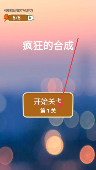 1、在疯狂的合成游戏中,当你准备好开始挑战时,点击开始关卡第1关按钮,即可开启第一关的游戏挑战,开启你的合成之旅。