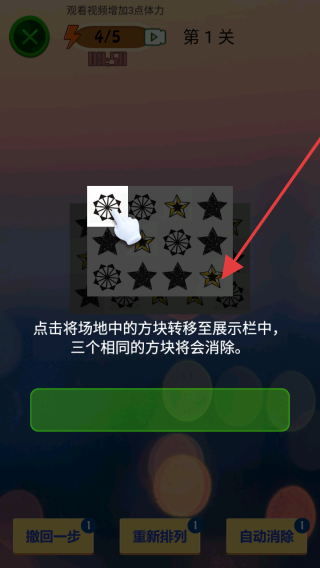 2、游戏规则为点击将场地中的方块转移至展示栏中,三个相同的方块将会消除。你需要仔细观察场地中的方块分布,合理选择并点击方块进行转移操作。