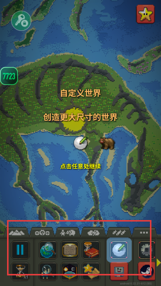 2、游戏中可进行自定义世界操作,点击对应按钮后能创造更大尺寸的世界,在下方工具栏中还能找到各类功能按钮辅助游戏进程。