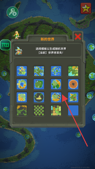 3、当进入新的世界界面时,会提示“选择模板以生成随机世界当前世界将丢失!”,此时可从众多模板中挑选一个来生成新的游戏世界。