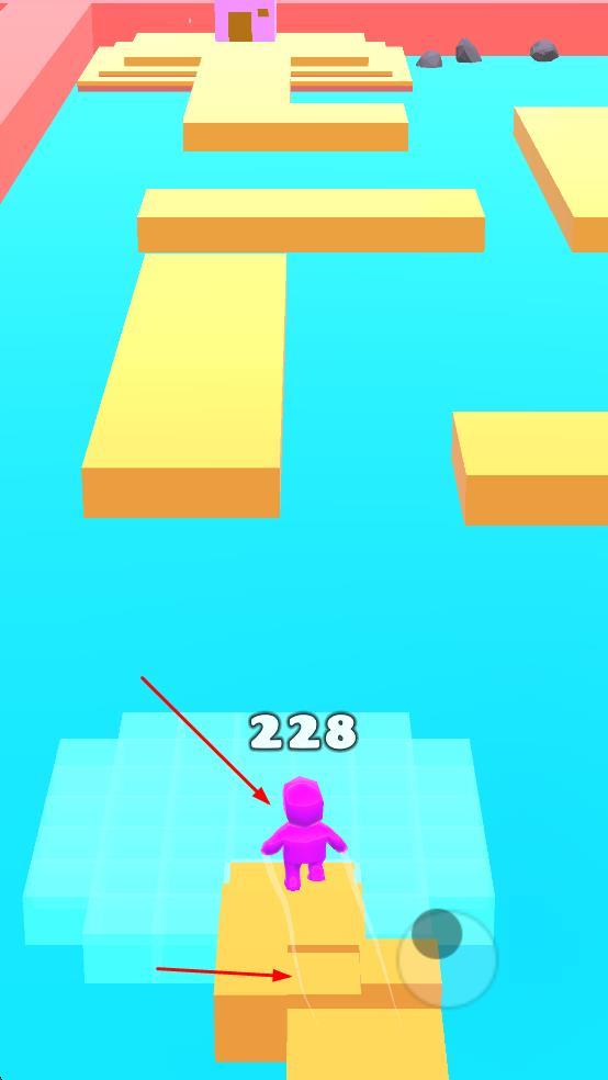 2、在路径行进中,留意方块分布,调整移动方向避开落水风险,保持行进节奏向终点靠近。