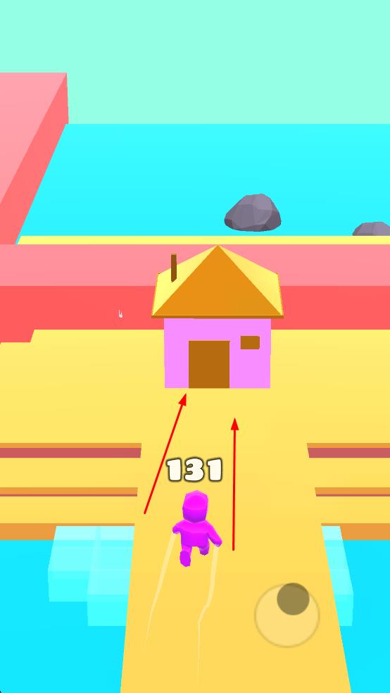 3、持续沿方块路径冲刺,顺利抵达粉色房屋终点,完成关卡挑战,推进游戏进程。