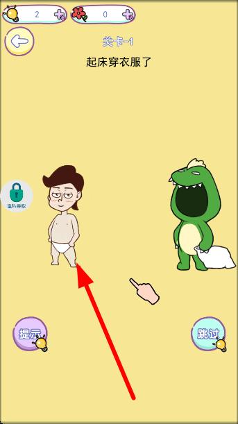 2、观察裸体角色,寻找隐藏衣物,拖动衣物为角色穿戴,注意恐龙干扰,完成穿衣任务,可点提示获得帮助。