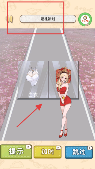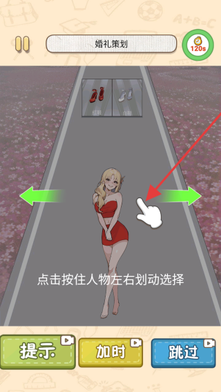 1、在游戏的婚礼策划关卡中,根据提示点击按住人物左右划动选择,通过左右滑动屏幕来为角色选择合适的鞋子,完成鞋子搭配任务。