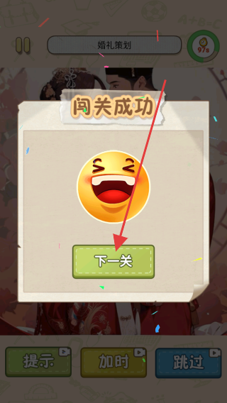 3、当你成功完成关卡后,会显示闯关成功界面,点击下一关按钮,即可进入下一个关卡,继续你的婚礼策划游戏挑战。