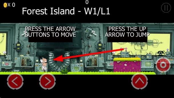 3、遇到紫色高台,点击上箭头按键让角色跳跃,跨越障碍,继续前行,收集金币道具,注意操作节奏与场景机关。