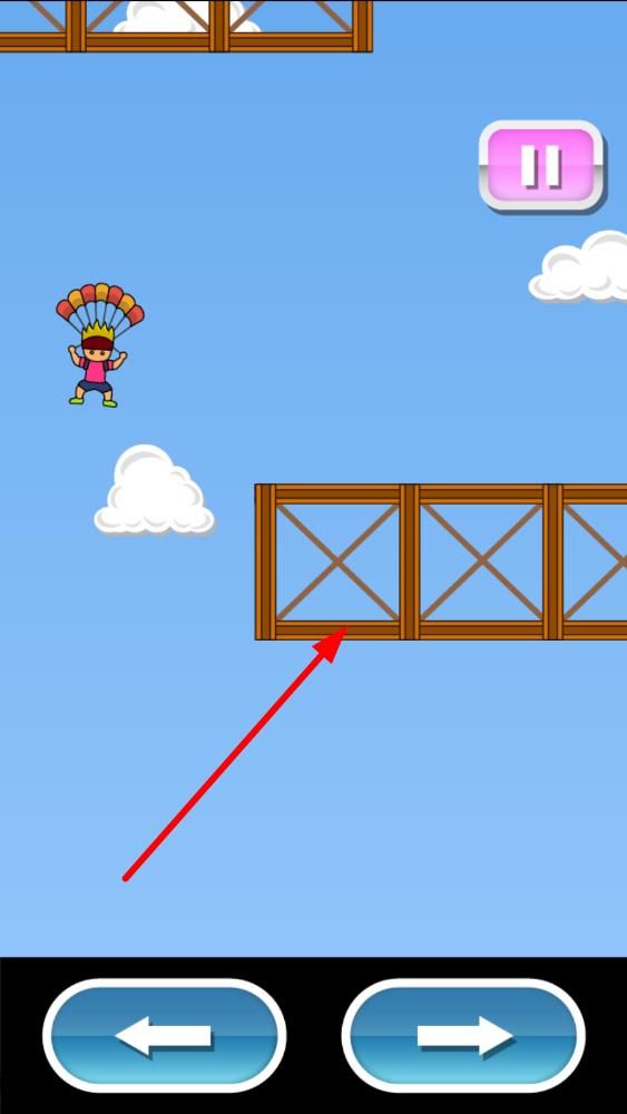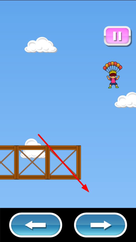 1、小男孩从空中开始降落,通过屏幕两侧虚拟按键控制左右移动,先熟悉按键灵敏度,尝试避开初始简单障碍。